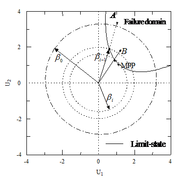 次迭代的超球外的失效樣本點,如圖4.1中的A、B點,分別求其概率密度函數,選取其中概率密度函數最大的樣本點,在其與坐標原點的連線方向上進行線性搜索,由于是內插搜索,因此一般經過2到3次搜索,即可確定該連線與極限狀態的近似交點,交點到原點的距離即為新的超球半徑