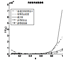 算例8.1非線性極限狀態(tài)函數(shù)為,其基本隨機(jī)變量均為正態(tài)分布且相互獨(dú)立的分布取為均值為0.5、標(biāo)準(zhǔn)差為0.2的正態(tài)分布。本例運(yùn)用Monte Carlo抽樣106個(gè)的樣本點(diǎn),得到4081個(gè)失效樣本來估計(jì)密度函數(shù)。以下給出四種擬合方法得到的失效概率函數(shù)和全局靈敏度的曲線圖。